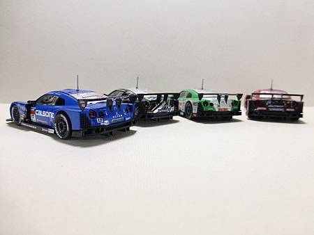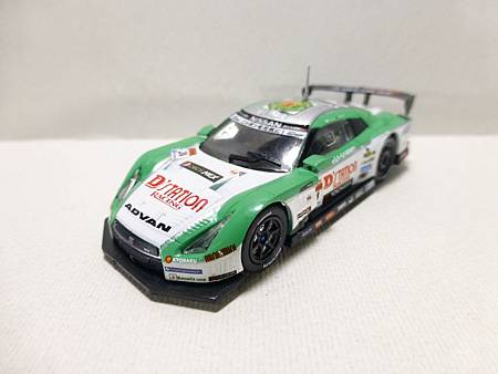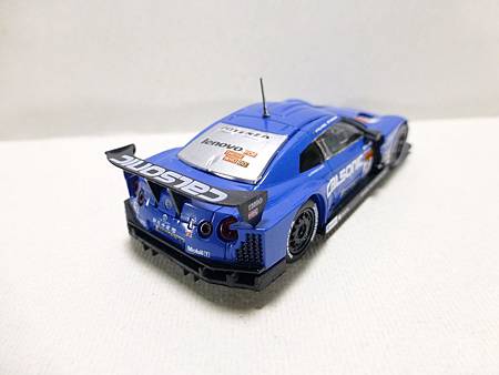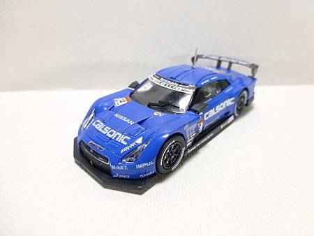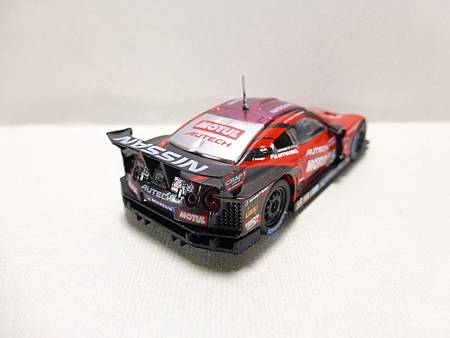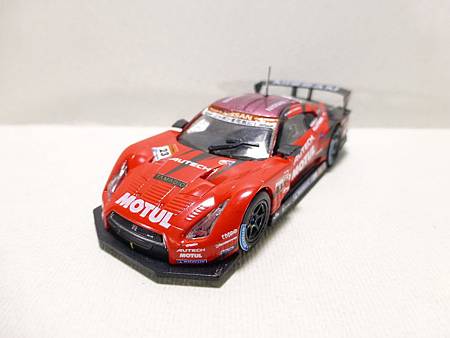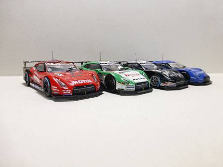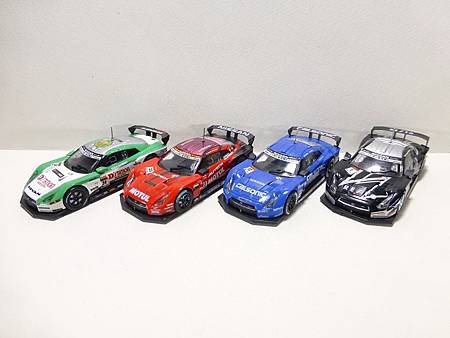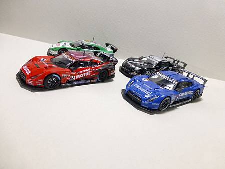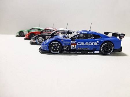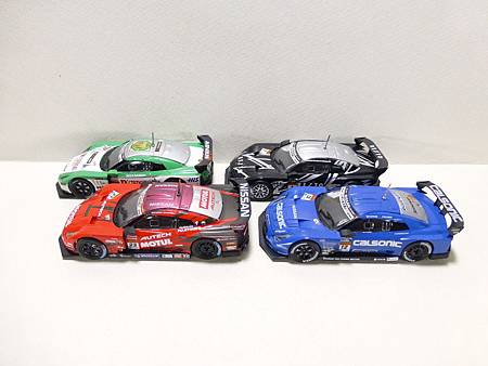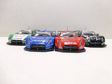 這是F-toys 1/64系列盒玩,名稱為《Nissan GT-R列傳》,車款是日產GT-R (R35)賽車,編號5號到8號四款都是同一個模組,採用不同的塗裝,其中藍色CALSONIC和紅色MOTUL AUTECH塗裝,都是tomica曾推出過的知名塗裝(雖然年份不同),十分吸引人。